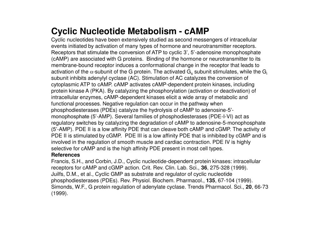 Cyclic Nucleotide Metabolism - cAMP Cyclic nucleotides have been extensively studied as second messengers of intracellular events initiated by activation of many types of hormone and neurotransmitter receptors. Receptors that stimulate the conversion of ATP to cyclic 3’, 5’-adenosine monophosphate (cAMP) are associated with G proteins. Binding of the hormone or neurotransmitter to its membrane-bound receptor induces a conformational change in the receptor that leads to activation of the -subunit of the G protein. The activated Gs subunit stimulates, while the Gi subunit inhibits adenylyl cyclase (AC). Stimulation of AC catalyzes the conversion of cytoplasmic ATP to cAMP. cAMP activates cAMP-dependent protein kinases, including protein kinase A (PKA). By catalyzing the phosphorylation (activation or deactivation) of intracellular enzymes, cAMP-dependent kinases elicit a wide array of metabolic and functional processes. Negative regulation can occur in the pathway when phosphodiesterases (PDEs) catalyze the hydrolysis of cAMP to adenosine-5’-monophosphate (5’-AMP). Several families of phosphodiesterases (PDE-I-VI) act as regulatory switches by catalyzing the degradation of cAMP to adenosine-5-monophosphate (5’-AMP). PDE II is a low affinity PDE that can cleave both cAMP and cGMP. The activity of PDE II is stimulated by cGMP. PDE III is a low affinity PDE that is inhibited by cGMP and is involved in the regulation of smooth muscle and cardiac contraction. PDE IV is highly selective for cAMP and is the high affinity PDE present in most cell types. References Francis, S.H., and Corbin, J.D., Cyclic nucleotide-dependent protein kinases: intracellular receptors for cAMP and cGMP action. Crit. Rev. Clin. Lab. Sci., 36, 275-328 (1999). Juilfs, D.M., et al., Cyclic GMP as substrate and regulator of cyclic nucleotide phosphodiesterases (PDEs). Rev. Physiol. Biochem. Pharmacol., 135, 67-104 (1999). Simonds, W.F., G protein regulation of adenylate cyclase. Trends Pharmacol. Sci., 20, 66-73 (1999).