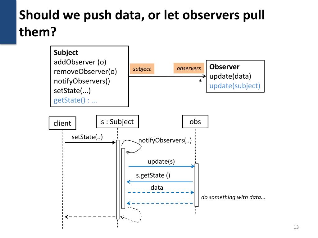 Should we push data, or let observers pull them? Subject addObserver (o) removeObserver(o) notifyObservers() setState(...) getState() : ... Observer update(data) update(subject) observers subject * s : Subject obs client setState(..) notifyObservers(..) update(s) s.getState () data do something with data...