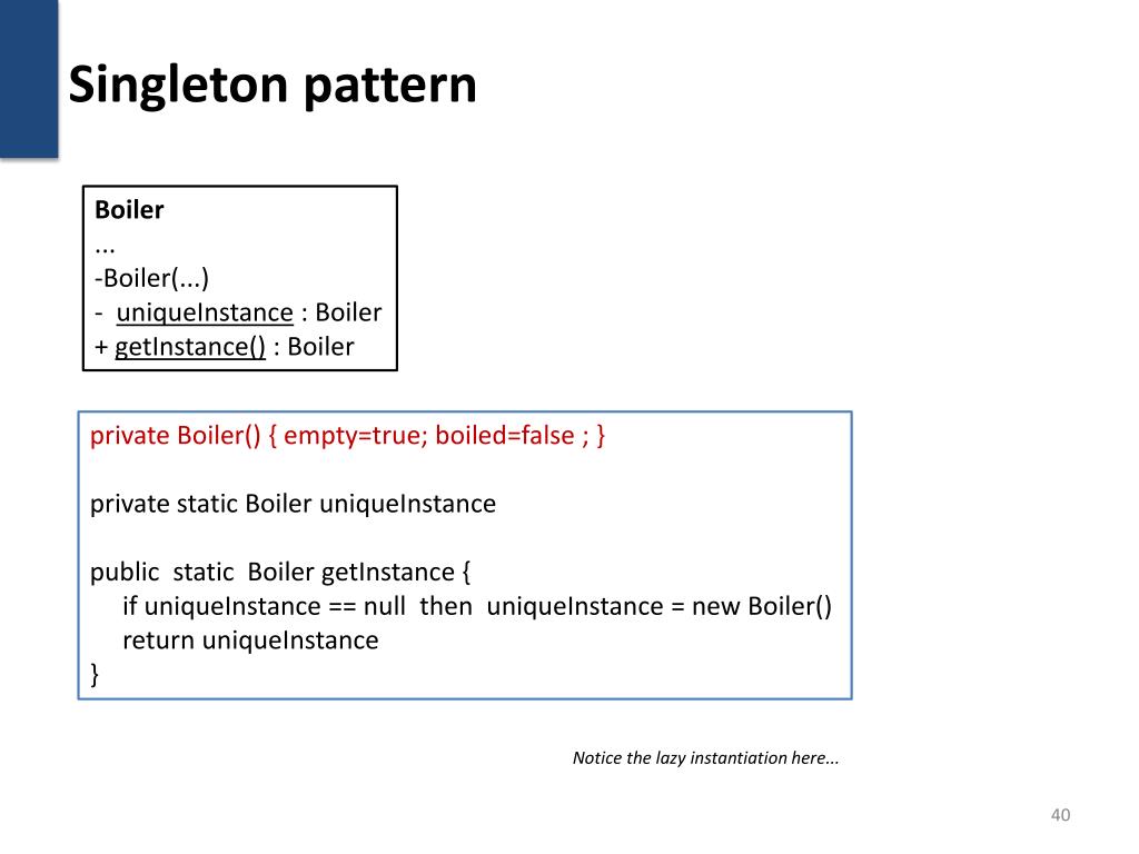 Singleton pattern • Boiler • ... • Boiler(...) • uniqueInstance: Boiler • + getInstance() : Boiler private Boiler() { empty=true; boiled=false ; } private static Boiler uniqueInstance public static Boiler getInstance { if uniqueInstance == null then uniqueInstance = new Boiler() return uniqueInstance } Notice the lazy instantiation here...