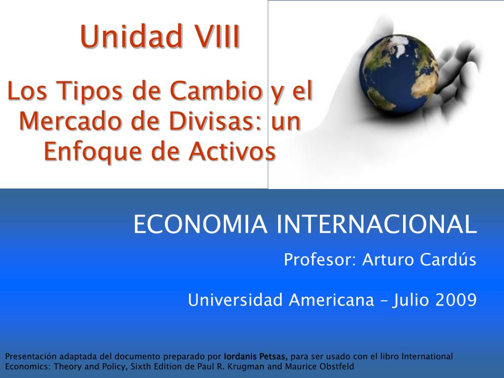 Unidad VIII Los Tipos de Cambio y el Mercado de Divisas: un Enfoque de Activos. ECONOMIA INTERNACIONAL. Profesor: Arturo Cardús Universidad Americana – Julio 2009.