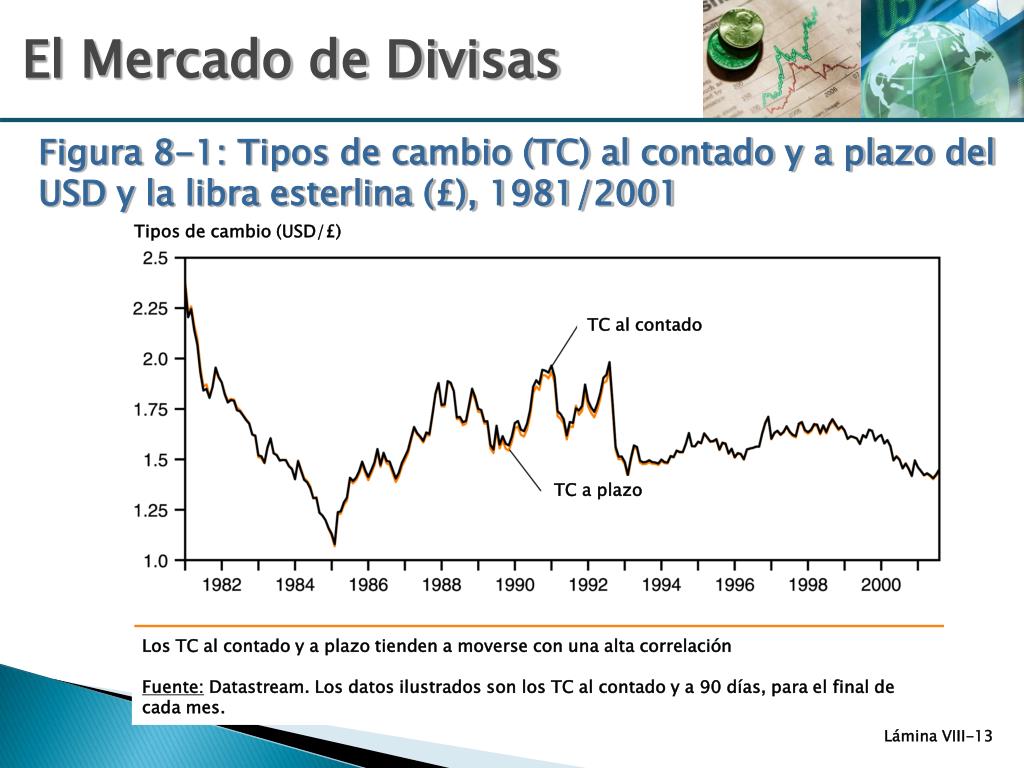 El Mercado de Divisas Figura 8-1: Tipos de cambio (TC) al contado y a plazo del USD y la libra esterlina (£), 1981/2001 Tipos de cambio (USD/£) TC al contado TC a plazo Los TC al contado y a plazo tienden a moverse con una alta correlación Fuente:Datastream. Los datos ilustrados son los TC al contado y a 90 días, para el final de cada mes.