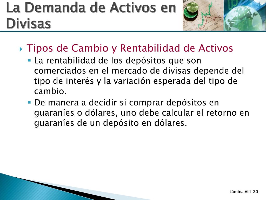 La Demanda de Activos en Divisas • Tipos de Interés • Los participantes del mercado necesitan dos piezas de información para poder comparar rentabilidades en diferentes depósitos: • Cómo se verá modificado el valor de sus depósitos • Cómo variarán los tipos de cambio de tal depósito • El tipo de interés es la cantidad de esa moneda que una persona puede ganar prestando una unidad de esa moneda por un año. • Ejemplo: A un tipo de interés de 3% anual, por cada 100 guaraníes prestados, se recibirá 103 guaraníes al final del año.
