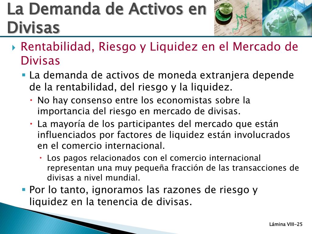 La Demanda de Activos en Divisas • El Riesgo y la Liquidez • Los ahorristas se preocupan sobre dos principales características de un activo, además de su rentabilidad esperada: • Riesgo • El factor de variabilidad que aporta a su riqueza. • Liquidez • La facilidad con que el activo puede ser vendido o intercambiado por otros bienes.