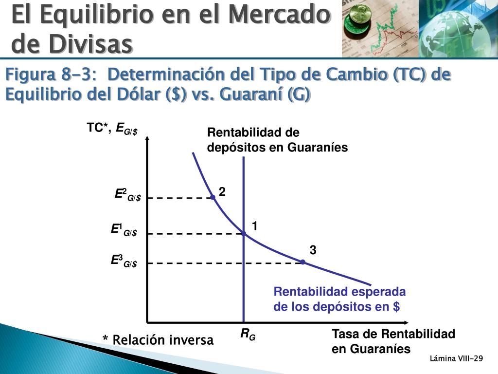 El Equilibrio en el Mercado de Divisas TC*, EG/$ Rentabilidad de depósitos en Guaraníes 2 E2G/$ 1 E1G/$ 3 E3G/$ Rentabilidad esperada de los depósitos en $ RG Tasa de Rentabilidad en Guaraníes Figura 8-3: Determinación del Tipo de Cambio (TC) de Equilibrio del Dólar ($) vs. Guaraní (G) * Relación inversa