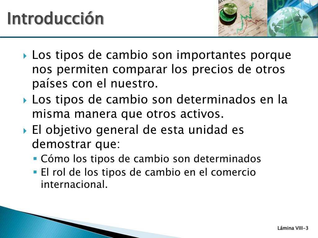 Introducción • Los tipos de cambio son importantes porque nos permiten comparar los precios de otros países con el nuestro. • Los tipos de cambio son determinados en la misma manera que otros activos. • El objetivo general de esta unidad es demostrar que: • Cómo los tipos de cambio son determinados • El rol de los tipos de cambio en el comercio internacional.
