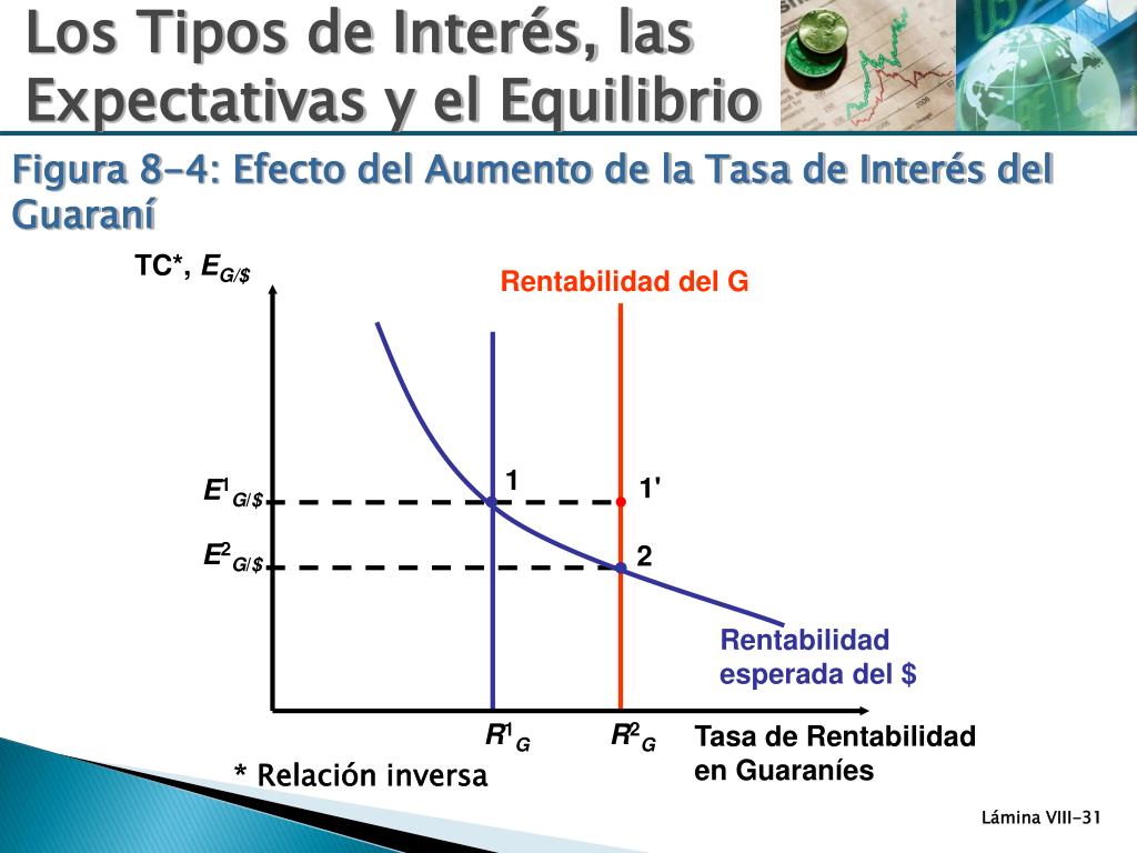 Los Tipos de Interés, las Expectativas y el Equilibrio TC*, EG/$ Rentabilidad del G Aumento de la tasa de interés del $ 2 E2G/$ E1G/$ 1 Rentabilidad esperada del $ R$ Tasa de Rentabilidad en Guaraníes Figura 8-5: Efecto del Aumento de la Tasa de Interés del Dólar * Relación inversa