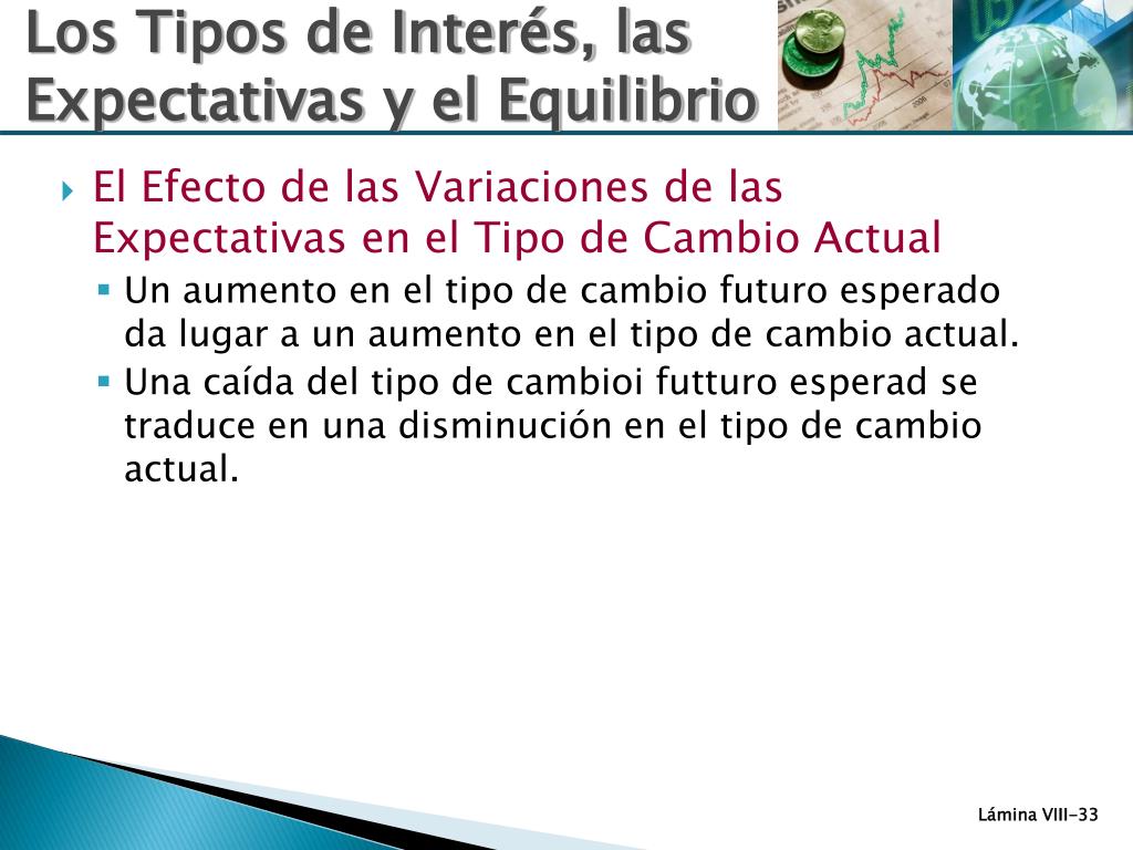 Los Tipos de Interés, las Expectativas y el Equilibrio • El Efecto de las Variaciones de las Expectativas en el Tipo de Cambio Actual • Un aumento en el tipo de cambio futuro esperado da lugar a un aumento en el tipo de cambio actual. • Una caída del tipo de cambioi futturo esperad se traduce en una disminución en el tipo de cambio actual.