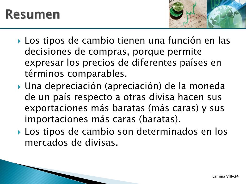 Resumen • Los tipos de cambio tienen una función en las decisiones de compras, porque permite expresar los precios de diferentes países en términos comparables. • Una depreciación (apreciación) de la moneda de un país respecto a otras divisa hacen sus exportaciones más baratas (más caras) y sus importaciones más caras (baratas). • Los tipos de cambio son determinados en los mercados de divisas.
