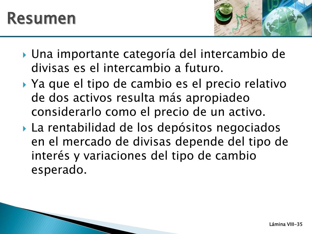 Resumen • Una importante categoría del intercambio de divisas es el intercambio a futuro. • Ya que el tipo de cambio es el precio relativo de dos activos resulta más apropiadeo considerarlo como el precio de un activo. • La rentabilidad de los depósitos negociados en el mercado de divisas depende del tipo de interés y variaciones del tipo de cambio esperado.