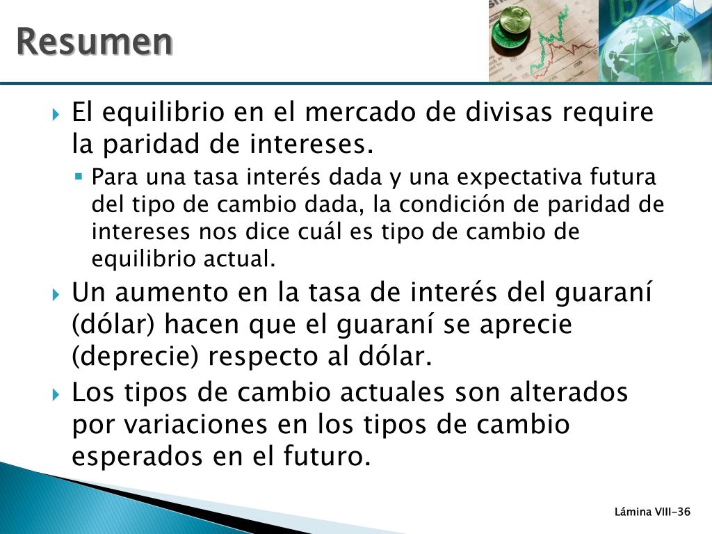 Resumen • El equilibrio en el mercado de divisas require la paridad de intereses. • Para una tasa interés dada y una expectativa futura del tipo de cambio dada, la condición de paridad de intereses nos dice cuál es tipo de cambio de equilibrio actual. • Un aumento en la tasa de interés del guaraní (dólar) hacen que el guaraní se aprecie (deprecie) respecto al dólar. • Los tipos de cambio actuales son alterados por variaciones en los tipos de cambio esperados en el futuro.