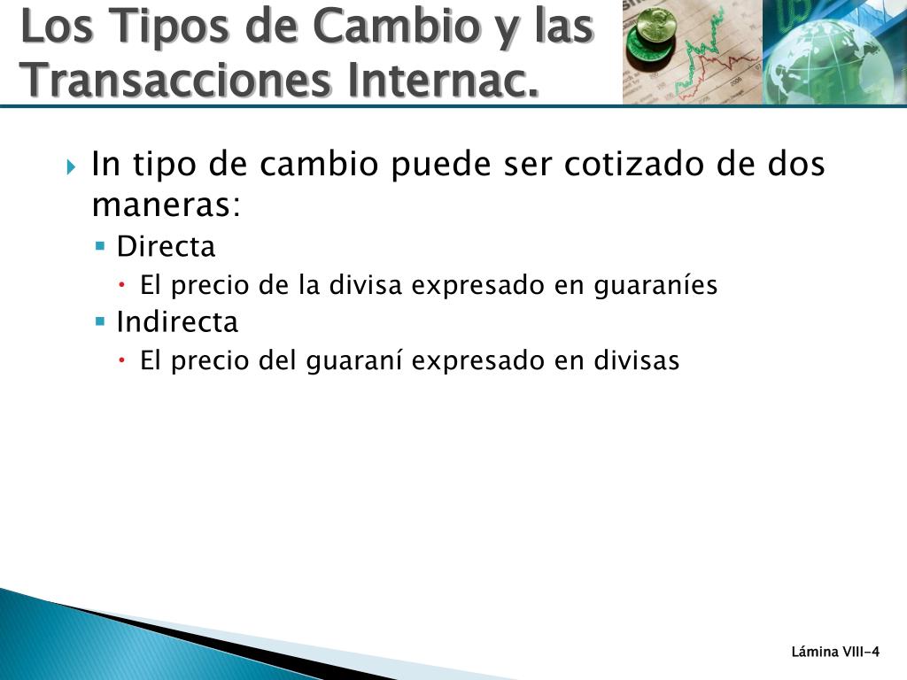 Los Tipos de Cambio y las Transacciones Internac. • In tipo de cambio puede ser cotizado de dos maneras: • Directa • El precio de la divisa expresado en guaraníes • Indirecta • El precio del guaraní expresado en divisas