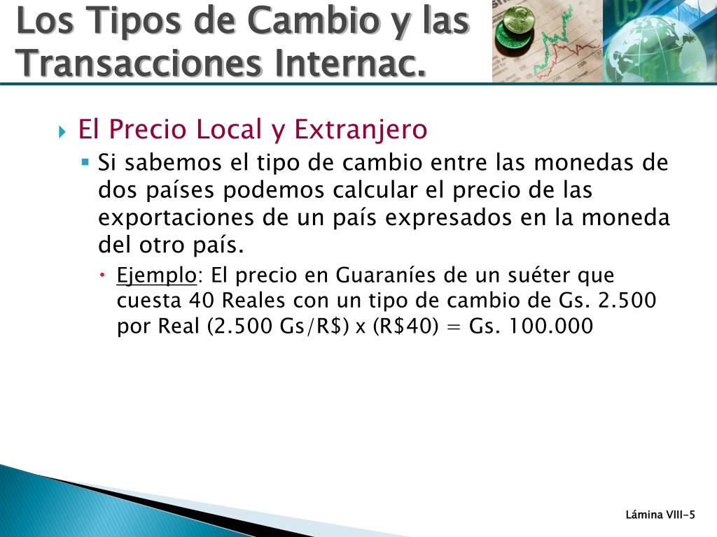 Los Tipos de Cambio y las Transacciones Internac. • El Precio Local y Extranjero • Si sabemos el tipo de cambio entre las monedas de dos países podemos calcular el precio de las exportaciones de un país expresados en la moneda del otro país. • Ejemplo: El precio en Guaraníes de un suéter que cuesta 40 Reales con un tipo de cambio de Gs. 2.500 por Real (2.500 Gs/R$) x (R$40) = Gs. 100.000