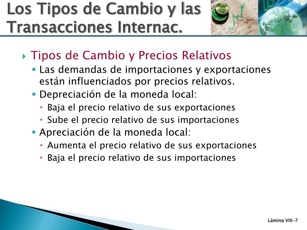 Los Tipos de Cambio y las Transacciones Internac. • Tipos de Cambio y Precios Relativos • Las demandas de importaciones y exportaciones están influenciados por precios relativos. • Depreciación de la moneda local: • Baja el precio relativo de sus exportaciones • Sube el precio relativo de sus importaciones • Apreciación de la moneda local: • Aumenta el precio relativo de sus exportaciones • Baja el precio relativo de sus importaciones