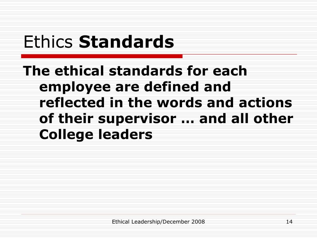 Ethics Standards The ethical standards for each employee are defined and reflected in the words and actions of their supervisor … and all other College leaders Ethical Leadership/December 2008