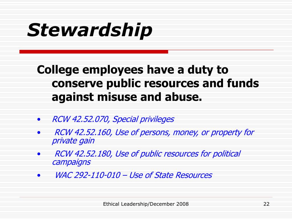 Stewardship • College employees have a duty to conserve public resources and funds against misuse and abuse. • RCW 42.52.070, Special privileges • RCW 42.52.160, Use of persons, money, or property for private gain • RCW 42.52.180, Use of public resources for political campaigns • WAC 292-110-010 – Use of State Resources Ethical Leadership/December 2008