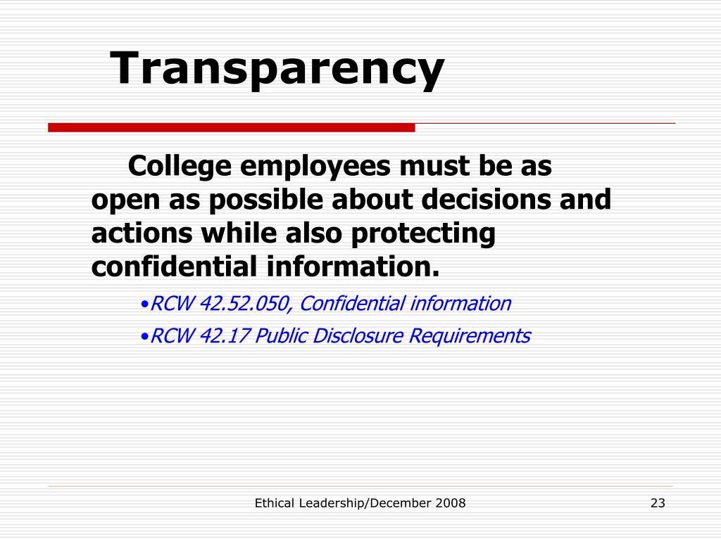 Transparency • College employees must be as open as possible about decisions and actions while also protecting confidential information. • RCW 42.52.050, Confidential information • RCW 42.17 Public Disclosure Requirements Ethical Leadership/December 2008