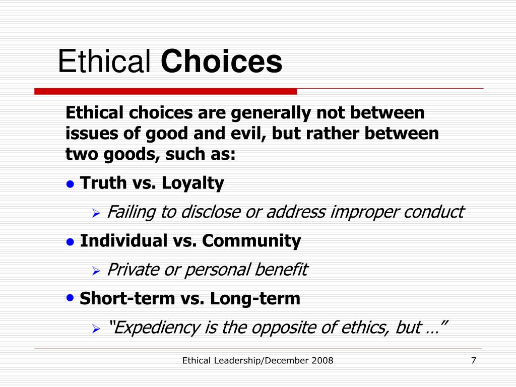 Ethical Choices • Ethical choices are generally not between issues of good and evil, but rather between two goods, such as: • Truth vs. Loyalty • Failing to disclose or address improper conduct • Individual vs. Community • Private or personal benefit • Short-term vs. Long-term • “Expediency is the opposite of ethics, but …” Ethical Leadership/December 2008