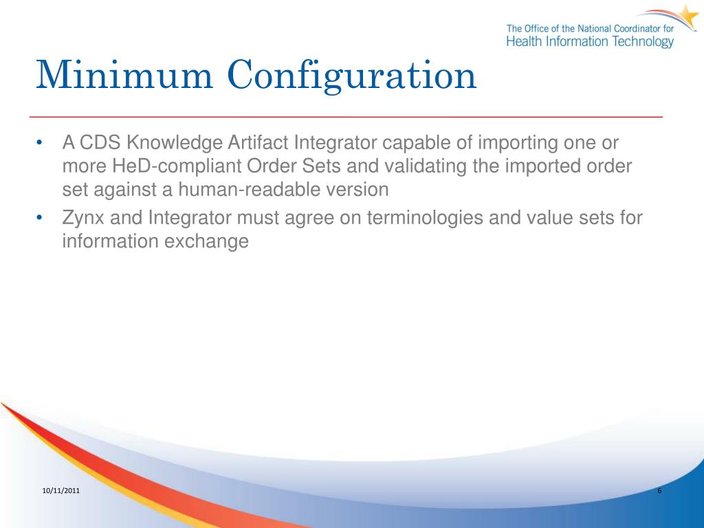 Minimum Configuration • A CDS Knowledge Artifact Integrator capable of importing one or more HeD-compliant Order Sets and validating the imported order set against a human-readable version • Zynx and Integrator must agree on terminologies and value sets for information exchange