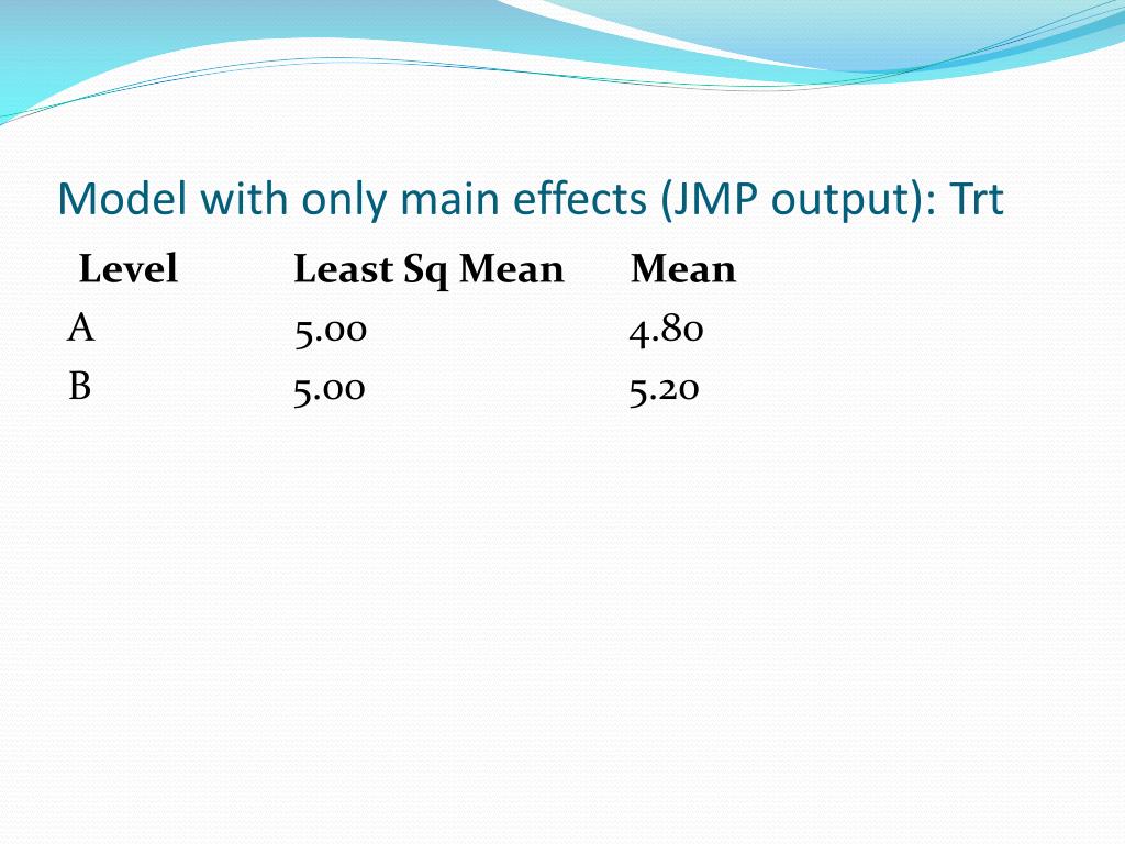 Model with only main effects (JMP output): Trt Level Least Sq Mean Mean A 5.00 4.80 B 5.00 5.20