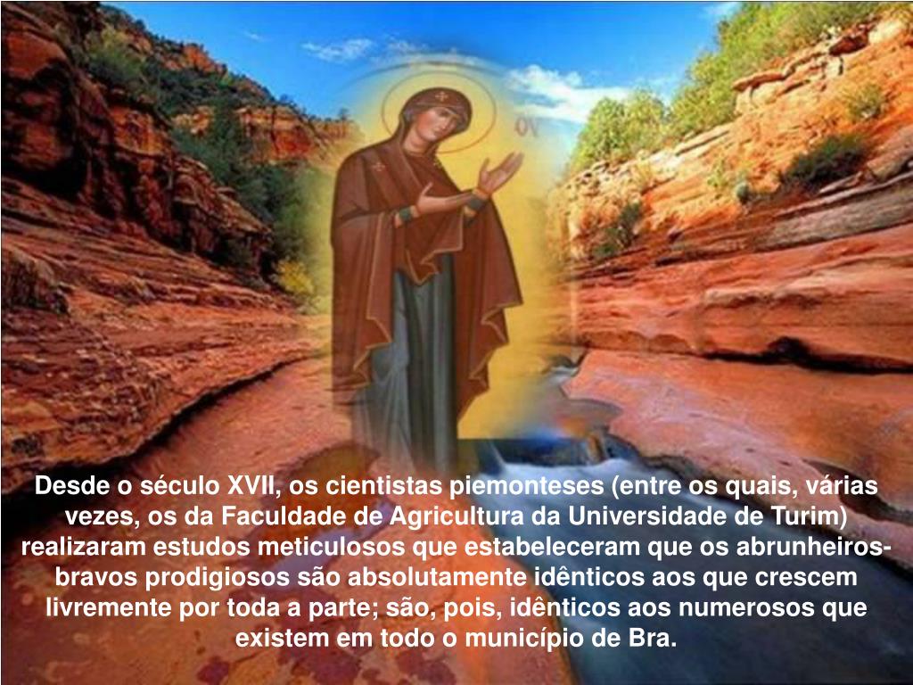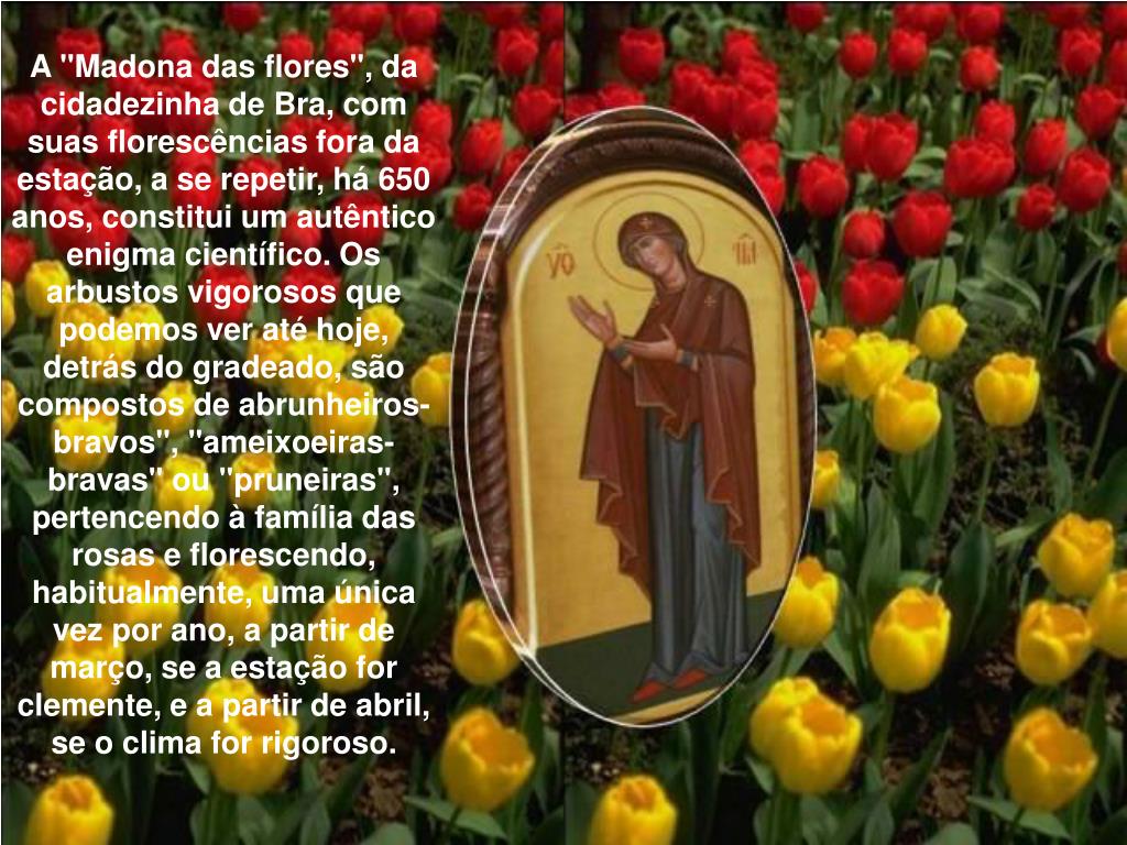 A "Madona das flores", da cidadezinha de Bra, com suas florescências fora da estação, a se repetir, há 650 anos, constitui um autêntico enigma científico. Os arbustos vigorosos que podemos ver até hoje, detrás do gradeado, são compostos de abrunheiros-bravos", "ameixoeiras-bravas" ou "pruneiras", pertencendo à família das rosas e florescendo, habitualmente, uma única vez por ano, a partir de março, se a estação for clemente, e a partir de abril, se o clima for rigoroso.