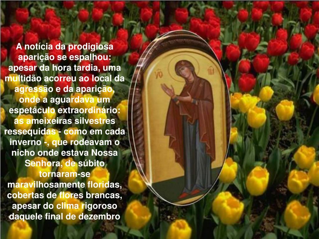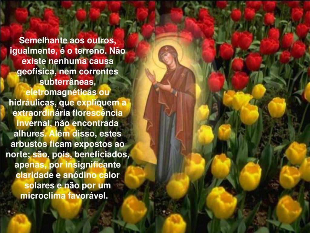Surpresa maior, porém, foi verificar que, as que estavam mais distantes do referido muro, continuavam sem flores. Desde então, a cada inverno se repete o misterioso e excepcional desabrochar das flores brancas de Nossa Senhora, com antecipação de três meses.