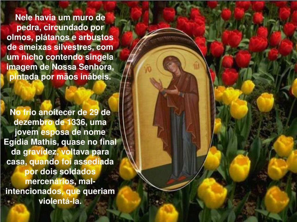 Nele havia um muro de pedra, circundado por olmos, plátanos e arbustos de ameixas silvestres, com um nicho contendo singela imagem de Nossa Senhora, pintada por mãos inábeis. No frio anoitecer de 29 de dezembro de 1336, uma jovem esposa de nome Egídia Mathis, quase no final da gravidez, voltava para casa, quando foi assediada por dois soldados mercenários, mal-intencionados, que queriam violentá-la.