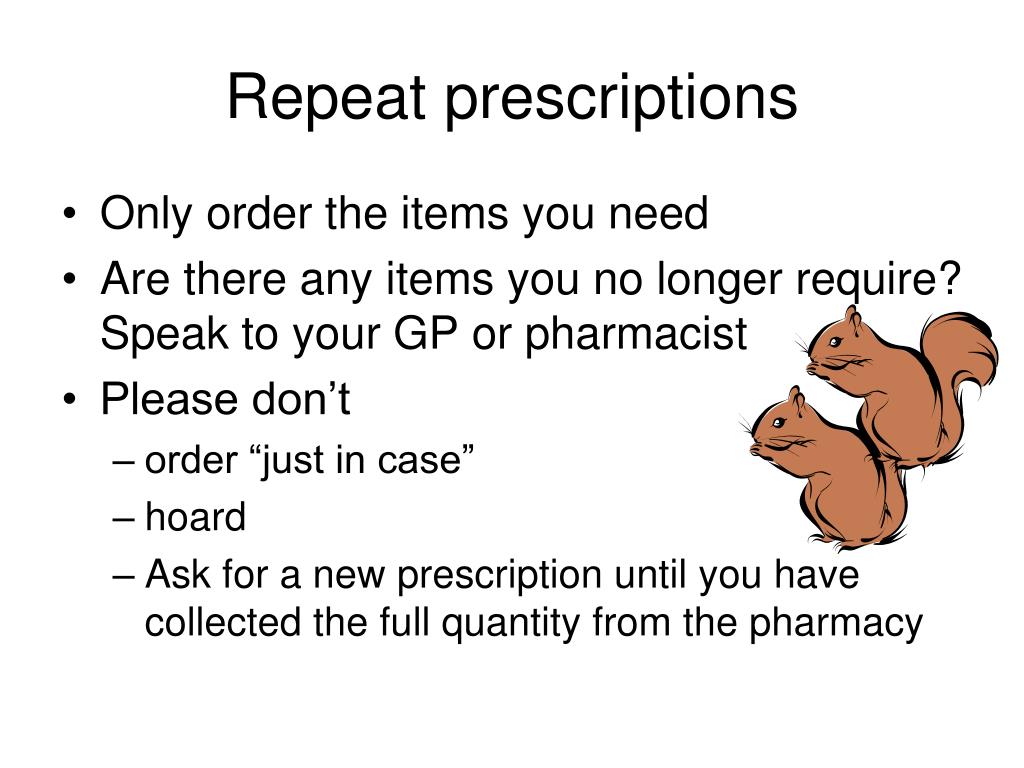 Repeat prescriptions • Only order the items you need • Are there any items you no longer require? Speak to your GP or pharmacist • Please don’t • order “just in case” • hoard • Ask for a new prescription until you have collected the full quantity from the pharmacy