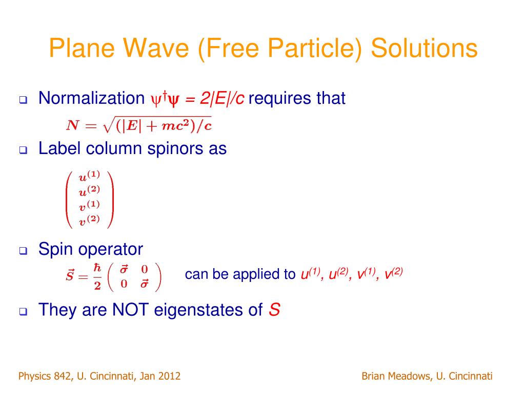 Plane Wave (Free Particle) Solutions • Normalization yyy= 2|E|/c requires that • Label column spinors as • Spin operator • They are NOT eigenstates of S can be applied to u(1), u(2), v(1), v(2) Brian Meadows, U. Cincinnati