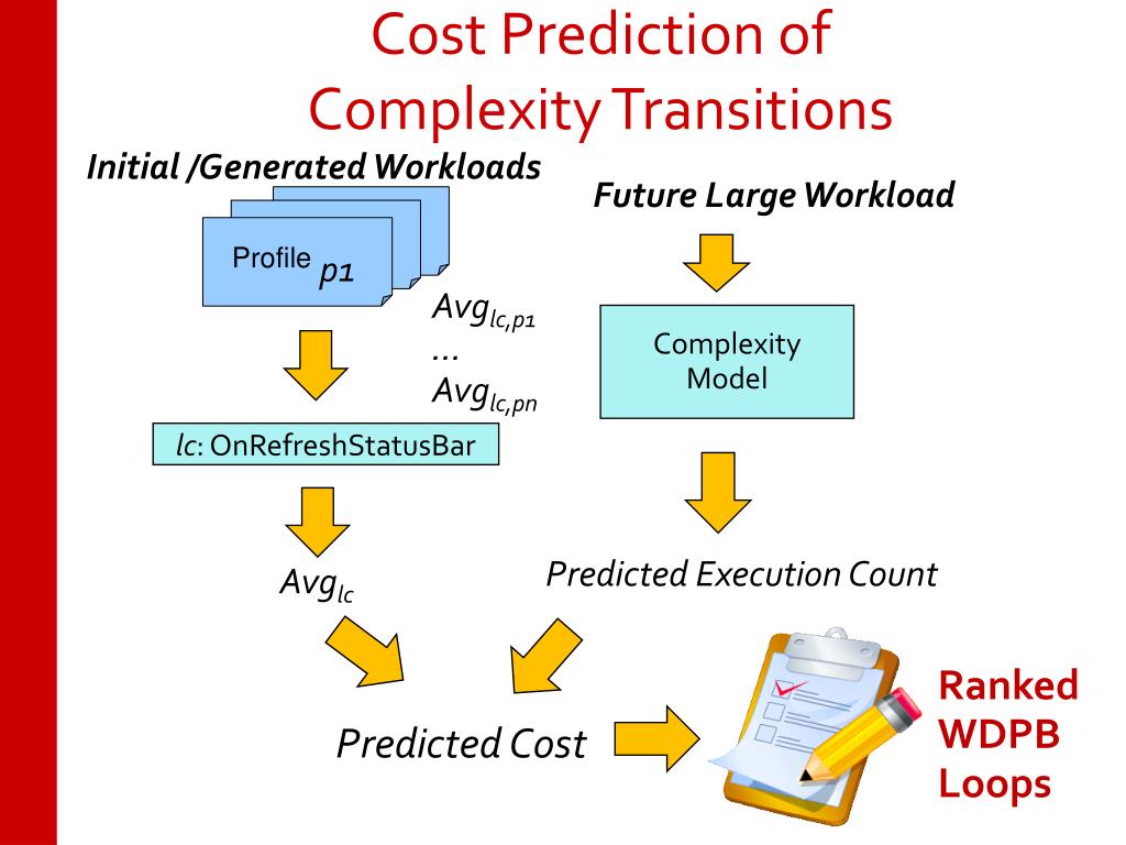 Cost Prediction of Complexity Transitions Initial /Generated Workloads Future Large Workload Profile p1 Avglc,p1 … Avglc,pn Complexity Model lc: OnRefreshStatusBar Predicted Execution Count Ranked WDPB Loops Avglc Predicted Cost