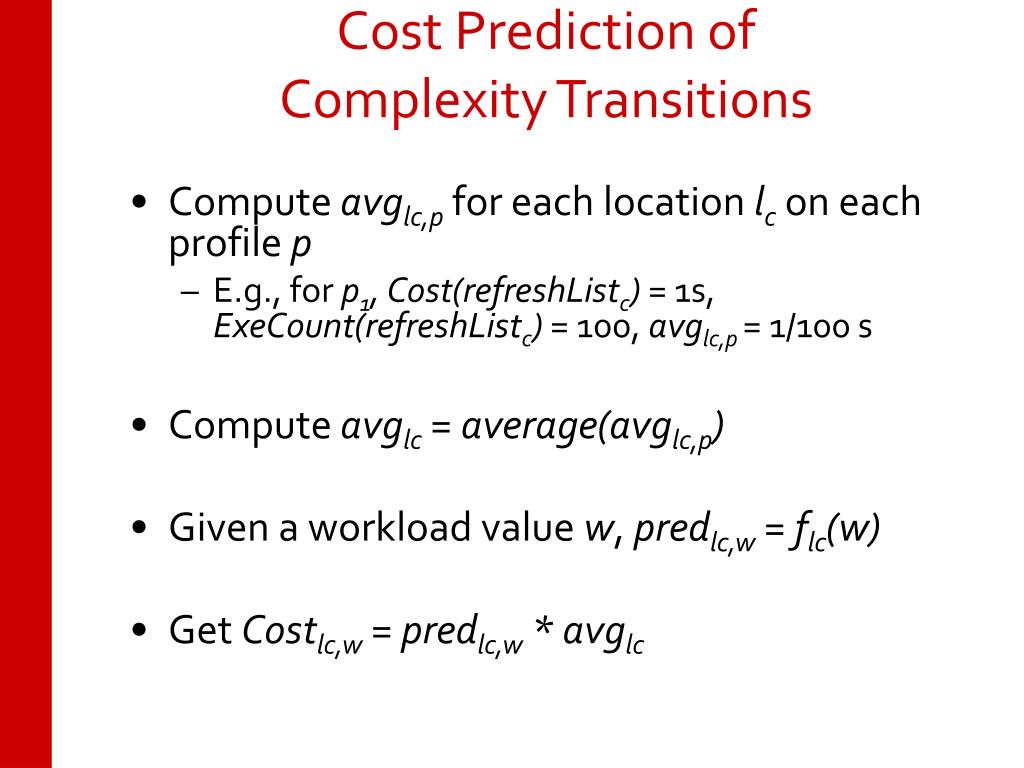 Cost Prediction of Complexity Transitions • Compute avglc,p for each location lc on each profile p • E.g., for p1, Cost(refreshListc) = 1s, ExeCount(refreshListc) = 100, avglc,p= 1/100 s • Compute avglc = average(avglc,p) • Given a workload value w, predlc,w = flc(w) • Get Costlc,w = predlc,w * avglc