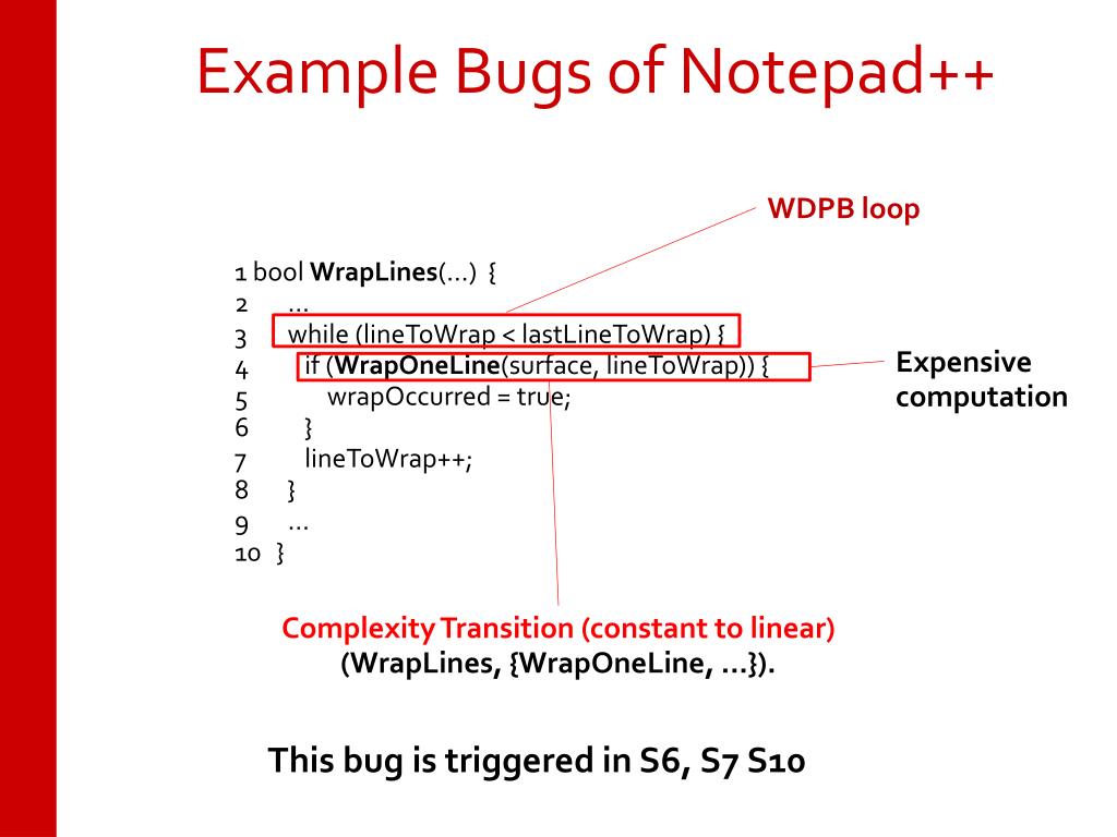 Example Bugs of Notepad++ WDPB loop 1 boolWrapLines(…) { … while (lineToWrap < lastLineToWrap) { if (WrapOneLine(surface, lineToWrap)) { wrapOccurred = true; } lineToWrap++; } … } Expensive computation Complexity Transition (constant to linear) (WrapLines, {WrapOneLine, ...}). This bug is triggered in S6, S7 S10