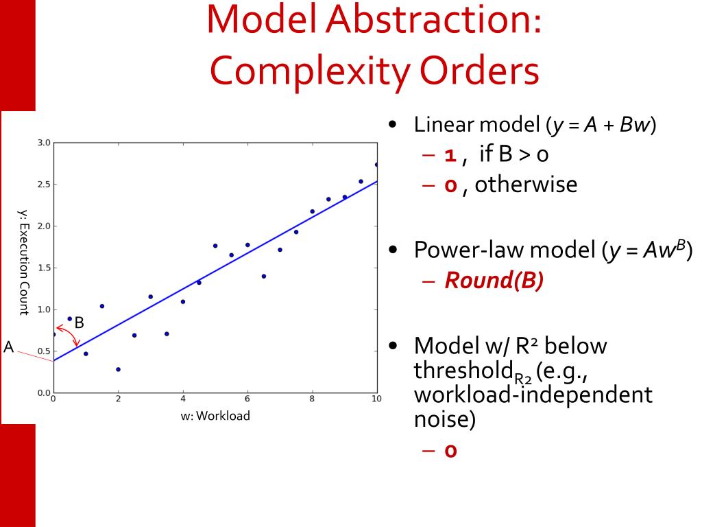 Model Abstraction: Complexity Orders • Linear model (y = A + Bw) • 1 , if B > 0 • 0 ,otherwise • Power-law model (y = AwB) • Round(B) • Model w/ R2 below thresholdR2 (e.g., workload-independent noise) • 0 y: Execution Count B A w: Workload
