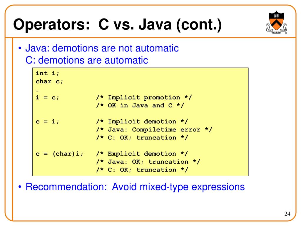 Operators: C vs. Java (cont.) • Java: demotions are not automaticC: demotions are automatic • Recommendation: Avoid mixed-type expressions int i; char c; … i = c; /* Implicit promotion */ /* OK in Java and C */ c = i; /* Implicit demotion */ /* Java: Compiletime error */ /* C: OK; truncation */ c = (char)i; /* Explicit demotion */ /* Java: OK; truncation */ /* C: OK; truncation */