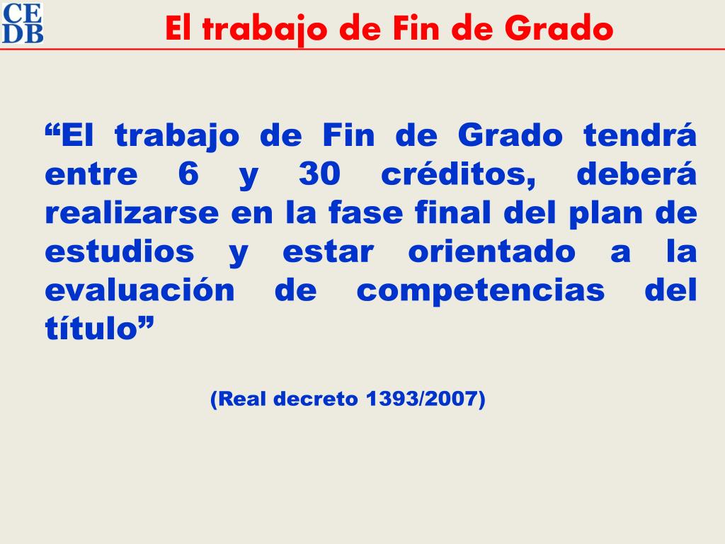 El trabajo de Fin de Grado “El trabajo de Fin de Grado tendrá entre 6 y 30 créditos, deberá realizarse en la fase final del plan de estudios y estar orientado a la evaluación de competencias del título” (Real decreto 1393/2007)