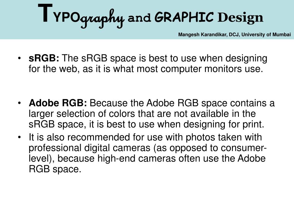 sRGB: The sRGB space is best to use when designing for the web, as it is what most computer monitors use. • Adobe RGB: Because the Adobe RGB space contains a larger selection of colors that are not available in the sRGB space, it is best to use when designing for print. • It is also recommended for use with photos taken with professional digital cameras (as opposed to consumer-level), because high-end cameras often use the Adobe RGB space.