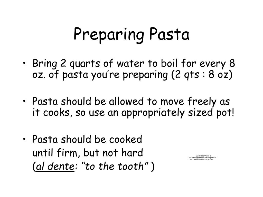 Preparing Pasta • Bring 2 quarts of water to boil for every 8 oz. of pasta you’re preparing (2 qts : 8 oz) • Pasta should be allowed to move freely as it cooks, so use an appropriately sized pot! • Pasta should be cooked until firm, but not hard (al dente: “to the tooth” )