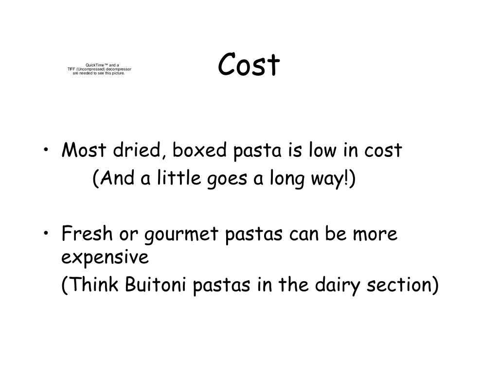Cost • Most dried, boxed pasta is low in cost (And a little goes a long way!) • Fresh or gourmet pastas can be more expensive (Think Buitoni pastas in the dairy section)