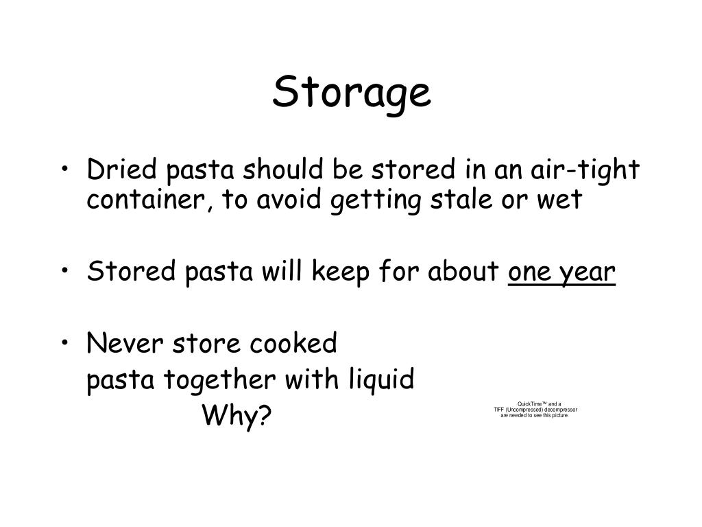 Storage • Dried pasta should be stored in an air-tight container, to avoid getting stale or wet • Stored pasta will keep for about one year • Never store cooked pasta together with liquid Why?