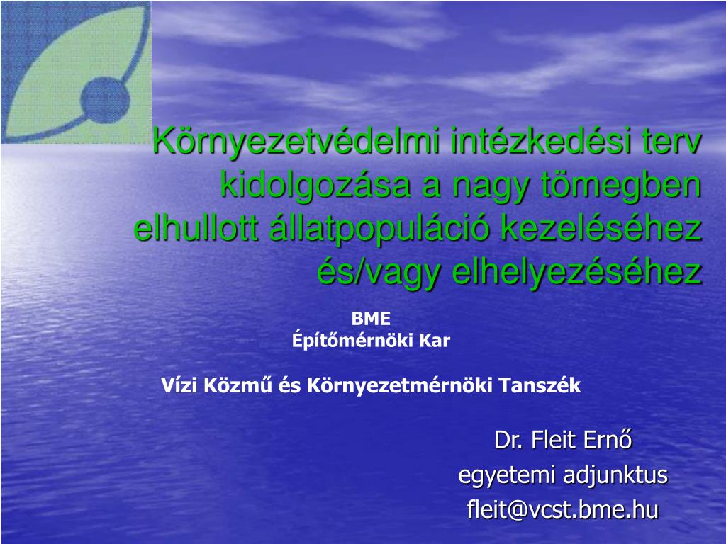 Környezetvédelmi intézkedési terv kidolgozása a nagy tömegben elhullott állatpopuláció kezeléséhez és/vagy elhelyezéséhez BME Építőmérnöki Kar Vízi Közmű és Környezetmérnöki Tanszék Dr. Fleit Ernő egyetemi adjunktus fleit@vcst.bme.hu