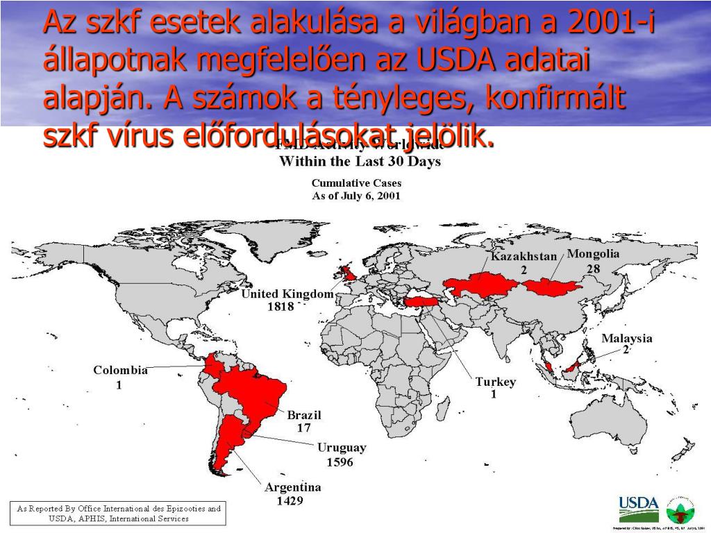 Az szkf esetek alakulása a világban a 2001-i állapotnak megfelelően az USDA adatai alapján. A számok a tényleges, konfirmált szkf vírus előfordulásokat jelölik.