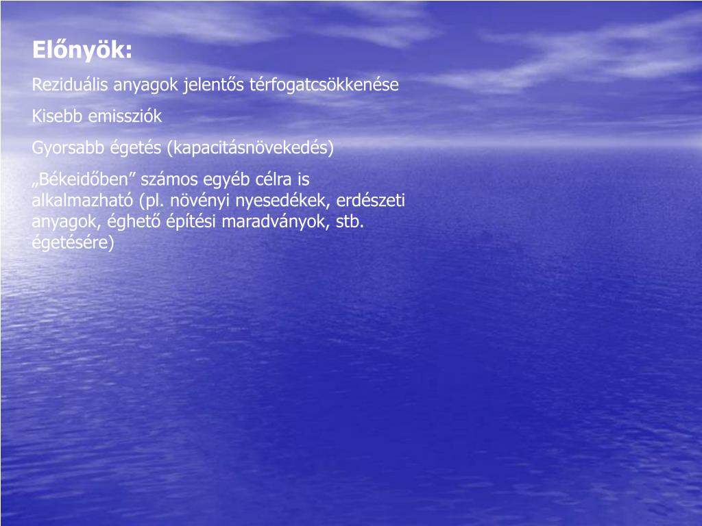 Előnyök: Reziduális anyagok jelentős térfogatcsökkenése Kisebb emissziók Gyorsabb égetés (kapacitásnövekedés) „Békeidőben” számos egyéb célra is alkalmazható (pl. növényi nyesedékek, erdészeti anyagok, éghető építési maradványok, stb. égetésére)