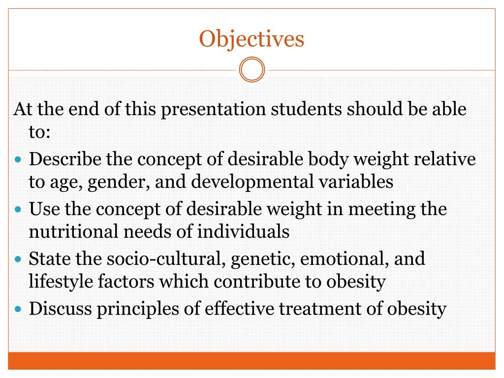 Objectives At the end of this presentation students should be able to: Describe the concept of desirable body weight relative to age, gender, and developmental variables Use the concept of desirable weight in meeting the nutritional needs of individuals State the socio-cultural, genetic, emotional, and lifestyle factors which contribute to obesity Discuss principles of effective treatment of obesity