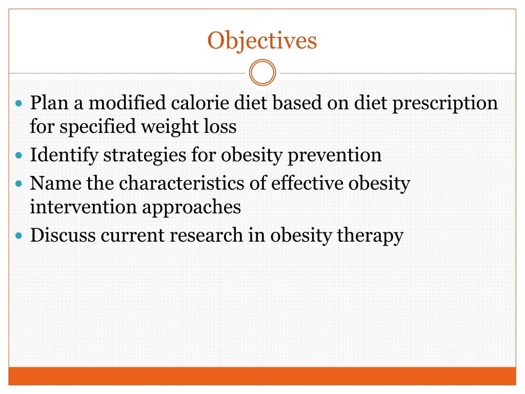 Objectives Plan a modified calorie diet based on diet prescription for specified weight loss Identify strategies for obesity prevention Name the characteristics of effective obesity intervention approaches Discuss current research in obesity therapy