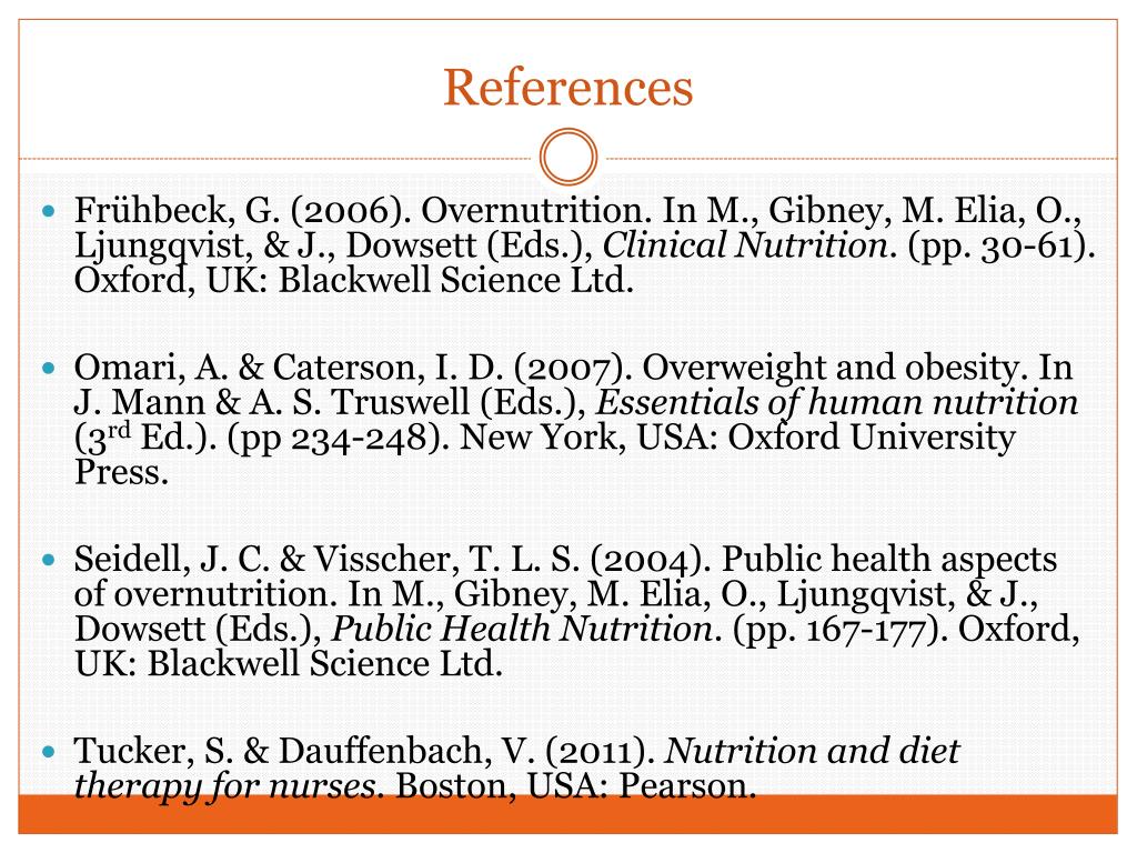 References Frühbeck, G. (2006). Overnutrition. In M., Gibney, M. Elia, O., Ljungqvist, & J., Dowsett (Eds.), Clinical Nutrition. (pp. 30-61). Oxford, UK: Blackwell Science Ltd. Omari, A. & Caterson, I. D. (2007). Overweight and obesity. In J. Mann & A. S. Truswell (Eds.), Essentials of human nutrition (3rd Ed.). (pp 234-248). New York, USA: Oxford University Press. Seidell, J. C. & Visscher, T. L. S. (2004). Public health aspects of overnutrition. In M., Gibney, M. Elia, O., Ljungqvist, & J., Dowsett (Eds.), Public Health Nutrition. (pp. 167-177). Oxford, UK: Blackwell Science Ltd. Tucker, S. & Dauffenbach, V. (2011). Nutrition and diet therapy for nurses. Boston, USA: Pearson.