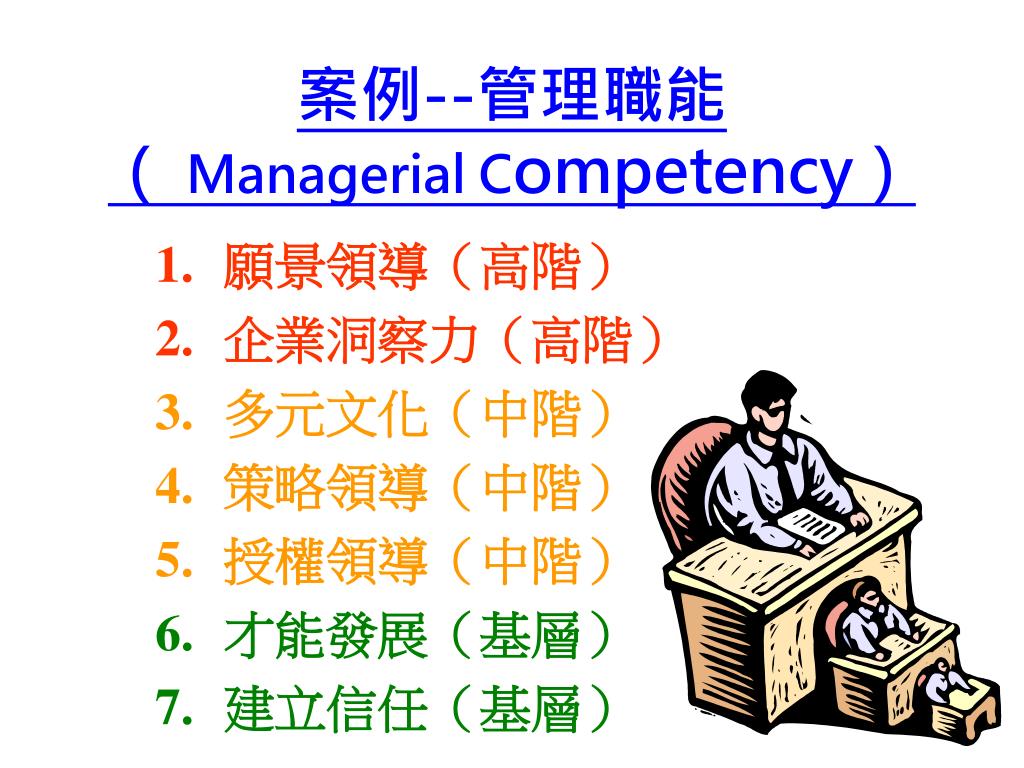 案例--管理職能 ( Managerial Competency) • 願景領導(高階) • 企業洞察力(高階) • 多元文化(中階) • 策略領導(中階) • 授權領導(中階) • 才能發展(基層) • 建立信任(基層)