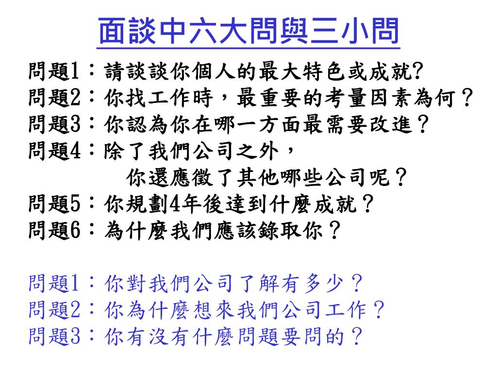 面談中六大問與三小問 問題1:請談談你個人的最大特色或成就? 問題2:你找工作時,最重要的考量因素為何? 問題3:你認為你在哪一方面最需要改進? 問題4:除了我們公司之外, 你還應徵了其他哪些公司呢? 問題5:你規劃4年後達到什麼成就? 問題6:為什麼我們應該錄取你? 問題1:你對我們公司了解有多少? 問題2:你為什麼想來我們公司工作? 問題3:你有沒有什麼問題要問的?