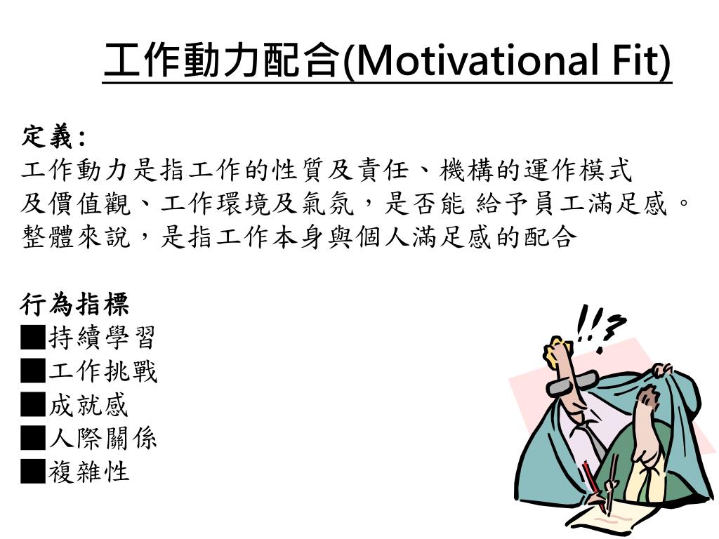 工作動力配合(Motivational Fit) 定義: 工作動力是指工作的性質及責任、機構的運作模式 及價值觀、工作環境及氣氛,是否能 給予員工滿足感。 整體來說,是指工作本身與個人滿足感的配合 行為指標 ■持續學習 ■工作挑戰 ■成就感 ■人際關係 ■複雜性