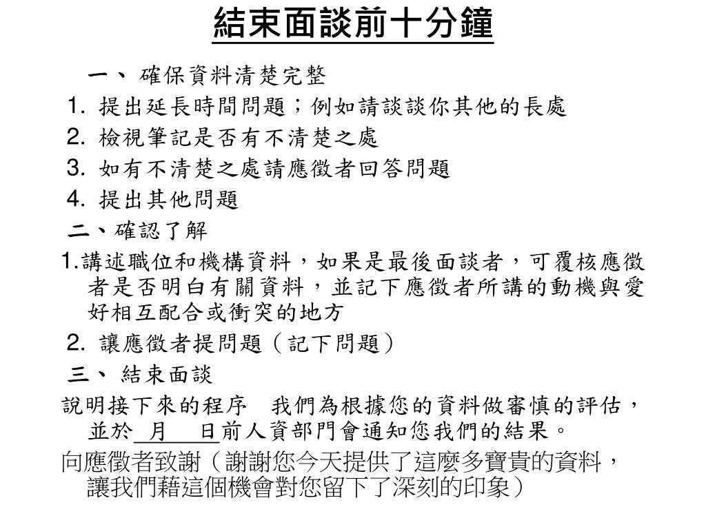 結束面談前十分鐘 一、確保資料清楚完整 1.提出延長時間問題;例如請談談你其他的長處 2.檢視筆記是否有不清楚之處 3.如有不清楚之處請應徵者回答問題 4.提出其他問題 二、確認了解 1.講述職位和機構資料,如果是最後面談者,可覆核應徵者是否明白有關資料,並記下應徵者所講的動機與愛好相互配合或衝突的地方 2.讓應徵者提問題(記下問題) 三、結束面談 說明接下來的程序我們為根據您的資料做審慎的評估,並於月日前人資部門會通知您我們的結果。 向應徵者致謝(謝謝您今天提供了這麼多寶貴的資料,讓我們藉這個機會對您留下了深刻的印象)