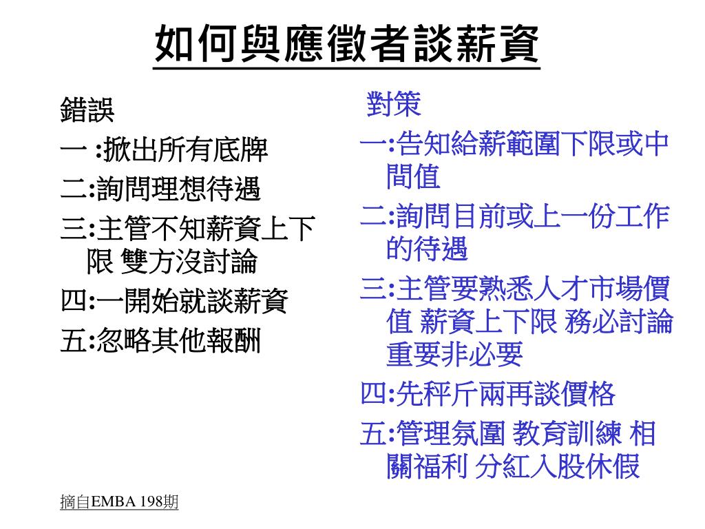 如何與應徵者談薪資 對策 一:告知給薪範圍下限或中間值 二:詢問目前或上一份工作的待遇 三:主管要熟悉人才市場價值 薪資上下限 務必討論 重要非必要 四:先秤斤兩再談價格 五:管理氛圍 教育訓練 相關福利 分紅入股休假 錯誤 一 :掀出所有底牌 二:詢問理想待遇 三:主管不知薪資上下限 雙方沒討論 四:一開始就談薪資 五:忽略其他報酬 摘自EMBA 198期