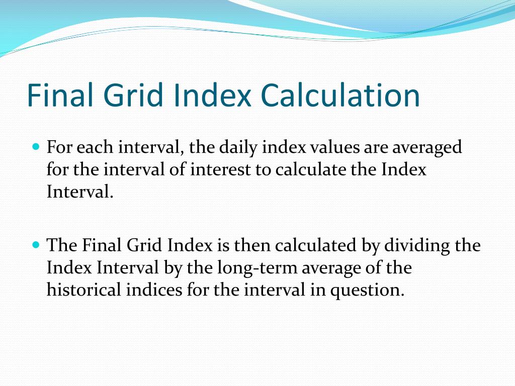 Final Grid Index Calculation • For each interval, the daily index values are averaged for the interval of interest to calculate the Index Interval. • The Final Grid Index is then calculated by dividing the Index Interval by the long-term average of the historical indices for the interval in question.